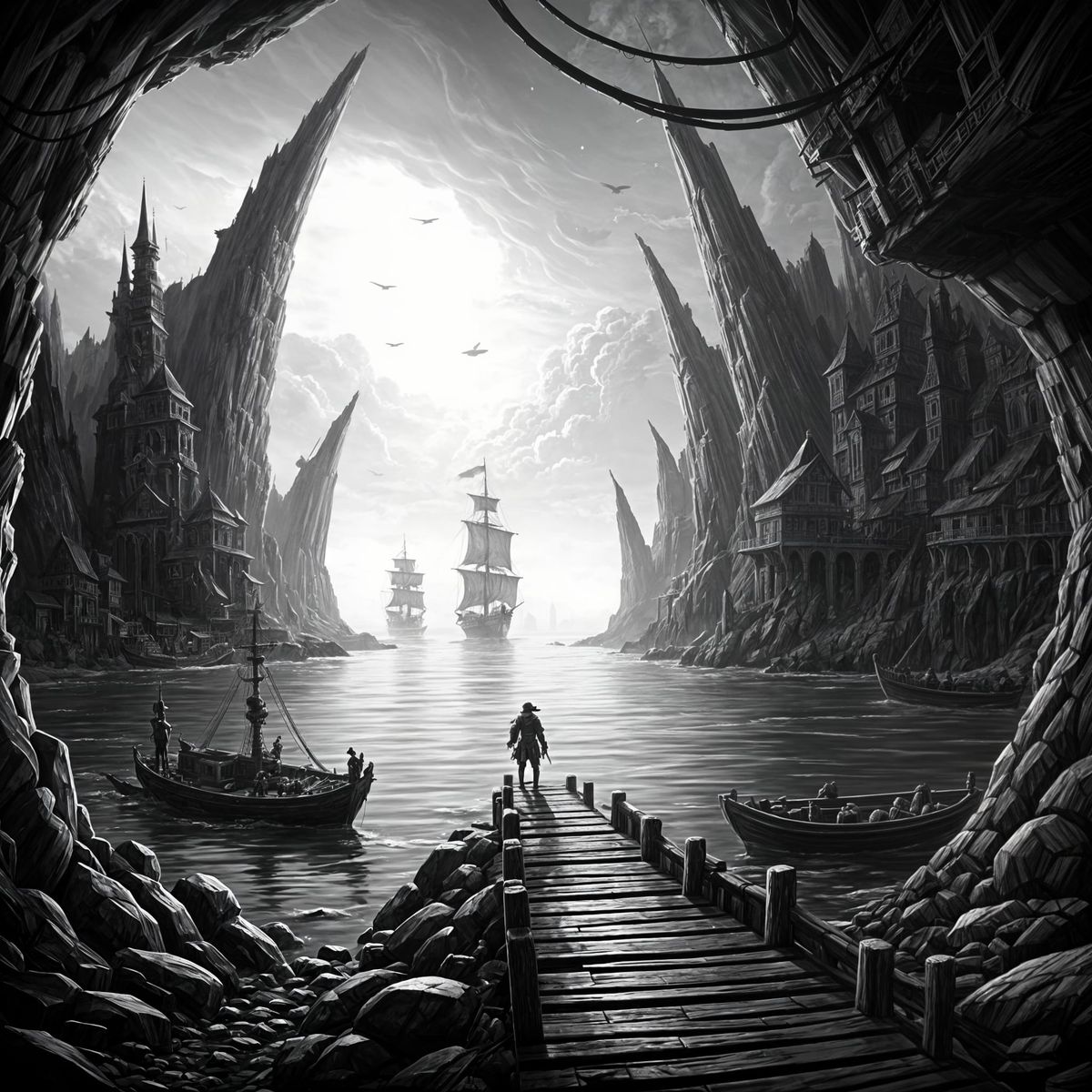 A dramatic, intricately detailed fantasy pirate harbor landscape, rendered in a sketchy doodle style with deep color and volumetric lighting, evoking a sense of cinematic brilliance and atmospheric depth.