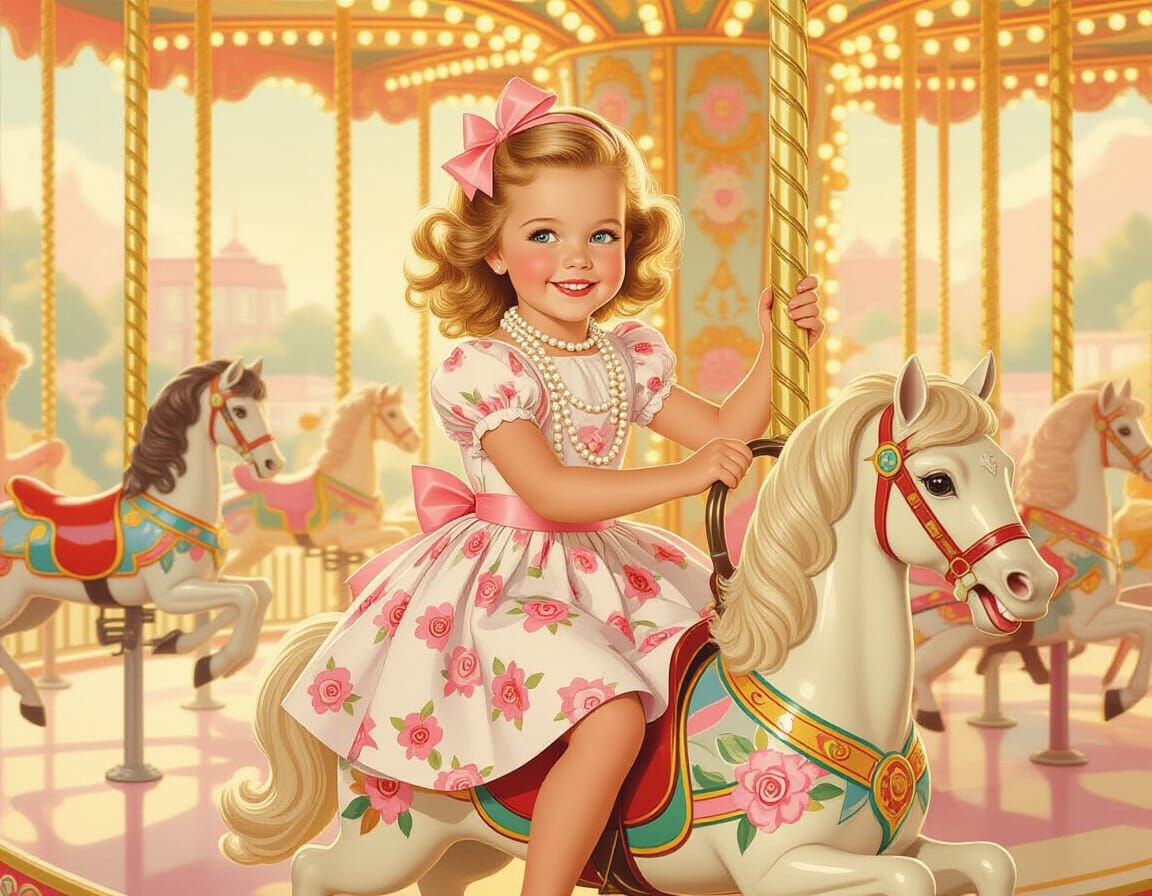A vintage-style image of a young girl in a floral dress and pearls riding a merry-go-round. The image is rendered with soft pastel colors and warm golden lighting reminiscent of classic pin-up art.