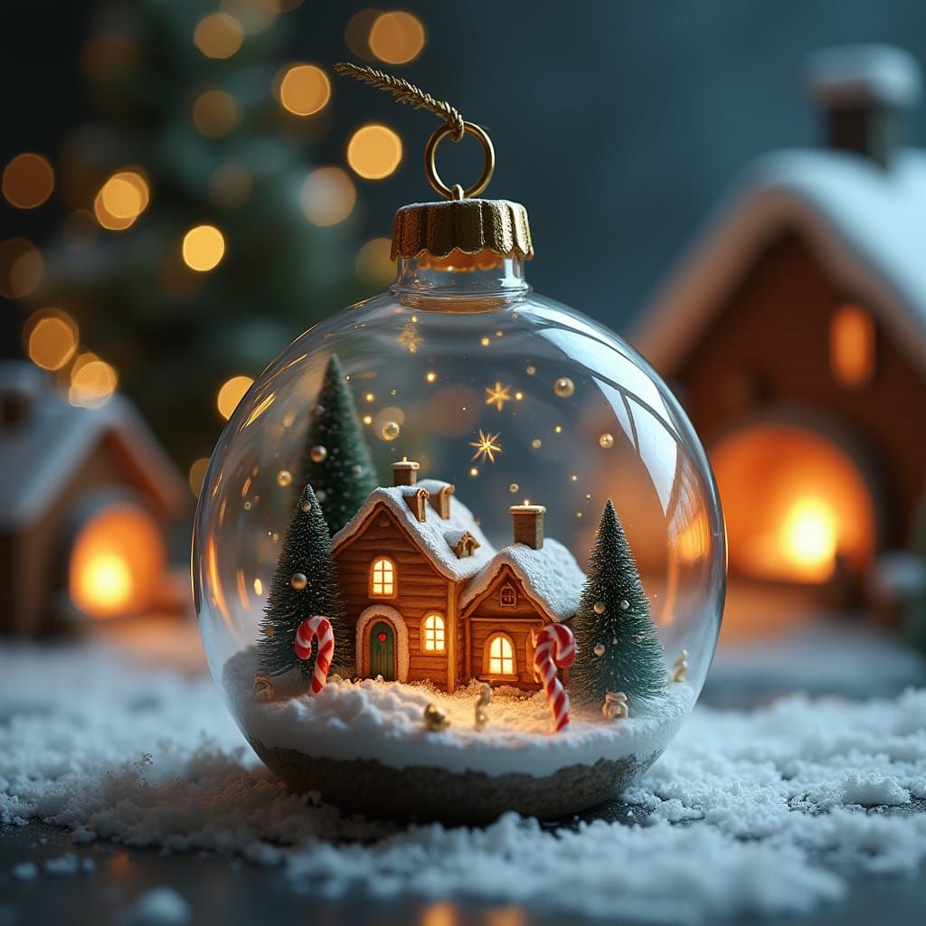 A hyperrealistic image of a Christmas bauble containing a detailed miniature village with glowing houses and a snowy cabin backdrop. The scene evokes a cozy, magical atmosphere with soft lighting.