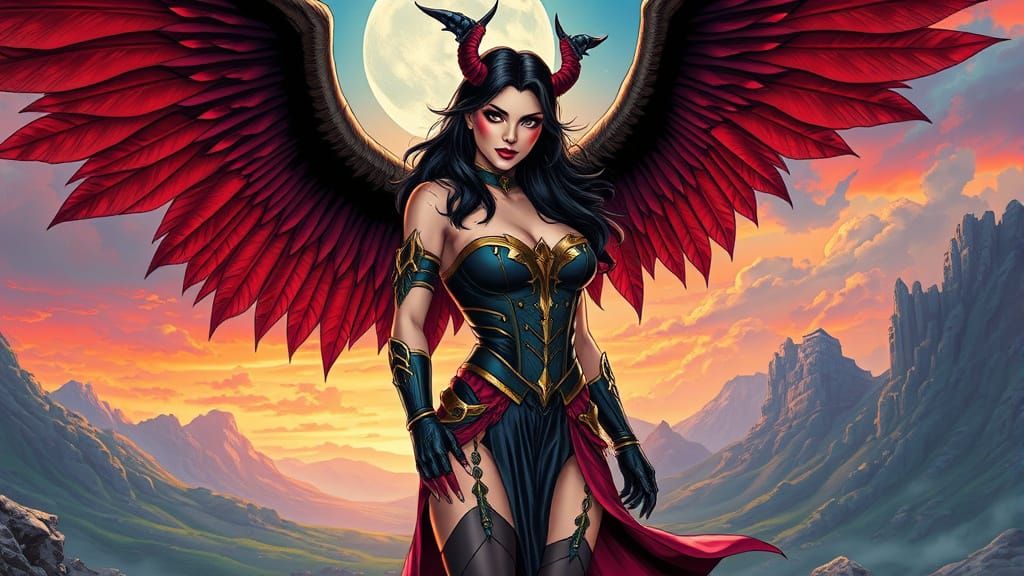 This image shows a striking vampire woman with eagle wings in a dynamic pose. She is wearing an elaborate cosplay outfit with vivid colors, rendered as smooth comic book art.