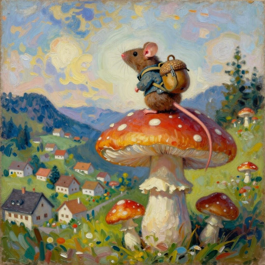 This image shows a tiny mouse explorer in climbing gear perched atop a giant mushroom, overlooking miniature Swiss villages. Rendered with thick oil paints and heavy brushstrokes, it evokes a sense of humble triumph.