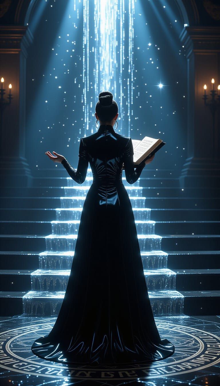 A striking picture of a sorceress in a latex uniform, chanting before a magical spellbook. Liquid magic illuminates the runic floor in this cinematic fantasy scene with gothic academia undertones.