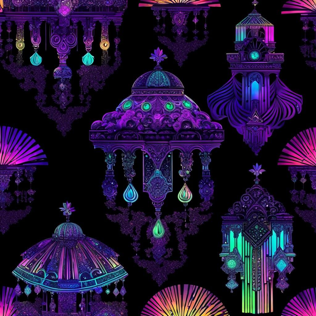 This image showcases a stunning formal dress with a vibrant, neon glow. The design is ornate and maximalist, presented in a dramatic, moody aesthetic.