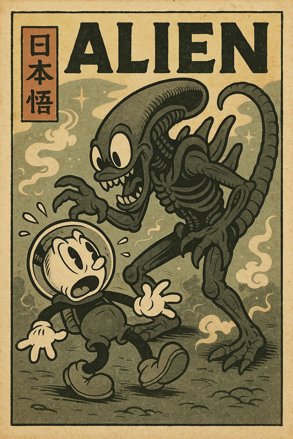 This image is a nostalgic depiction of an alien movie poster, created in a unique blend of 1920s vintage cartoon and traditional ukiyo-e styles, capturing the essence of a bygone era.