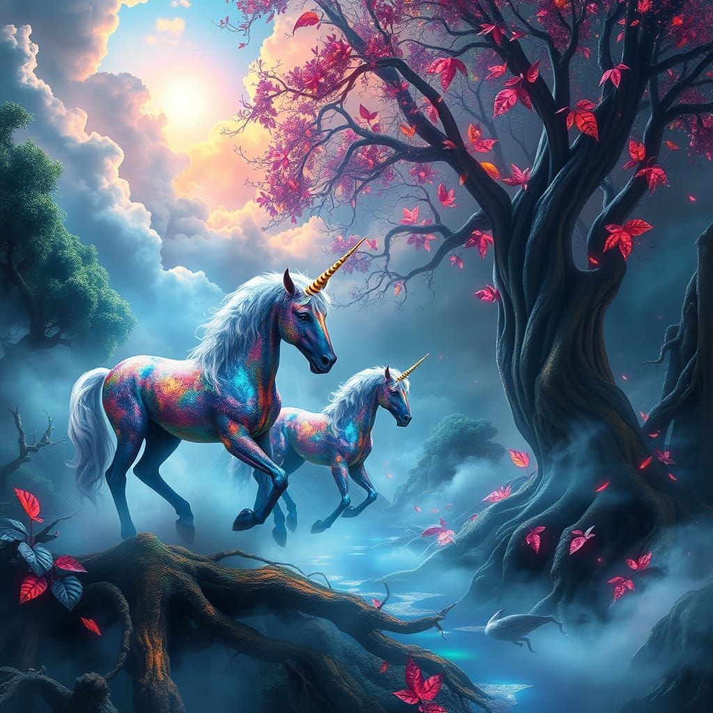 This surreal image depicts a fantastical landscape of luminous mists, shimmering flora, and vibrant colors, reminiscent of a lucid dream. Majestic, iridescent creatures roam freely amidst intricate, detailed elements, evoking a cinematic, maximalist artistry.