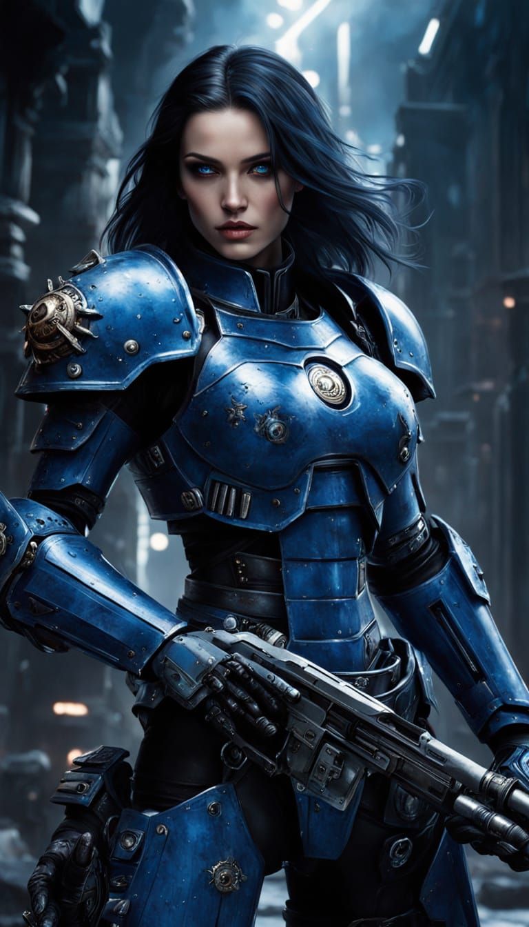 "A hyper-realistic, hyper-detailed illustration inspired by Warhammer 40k aesthetics and Luis Royo's vivid imagery; dramatic, moody lighting emphasizing shadows and depth; futuristic, militaristic characters in emotionally intense, dark sci-fi settings; impressionistic glow subdued to shadows; ...