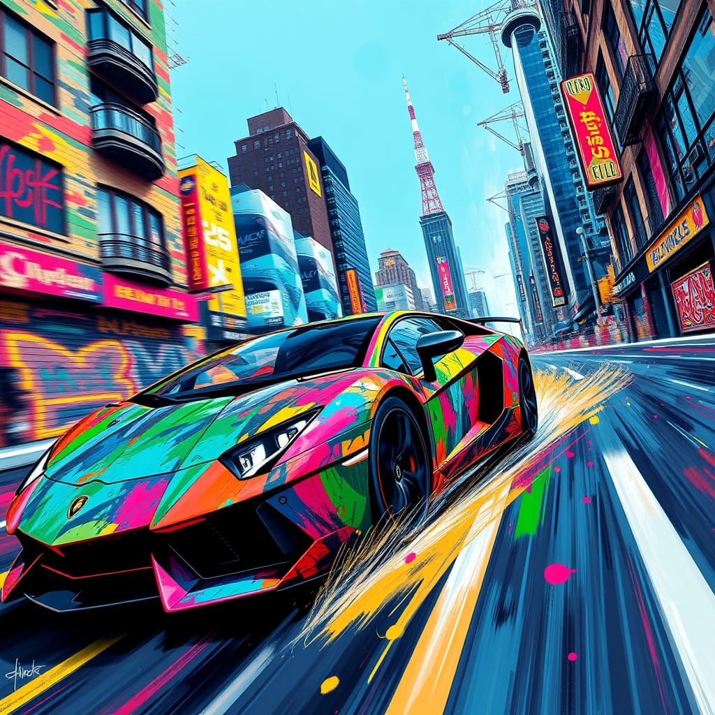 A high-speed Lamborghini Revuelto races through a colorful urban landscape. The image blends street and splash art, with bold strokes, melting effects, and intricate details in polychromatic hues. It is reminiscent of digital art.