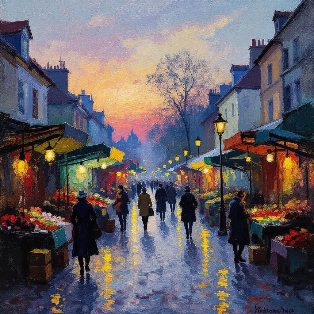 This image shows a vibrant street market at sunset, illuminated by glowing lamps. Rendered in an impressionist style with visible brushstrokes and rich colors, it captures the lively atmosphere.