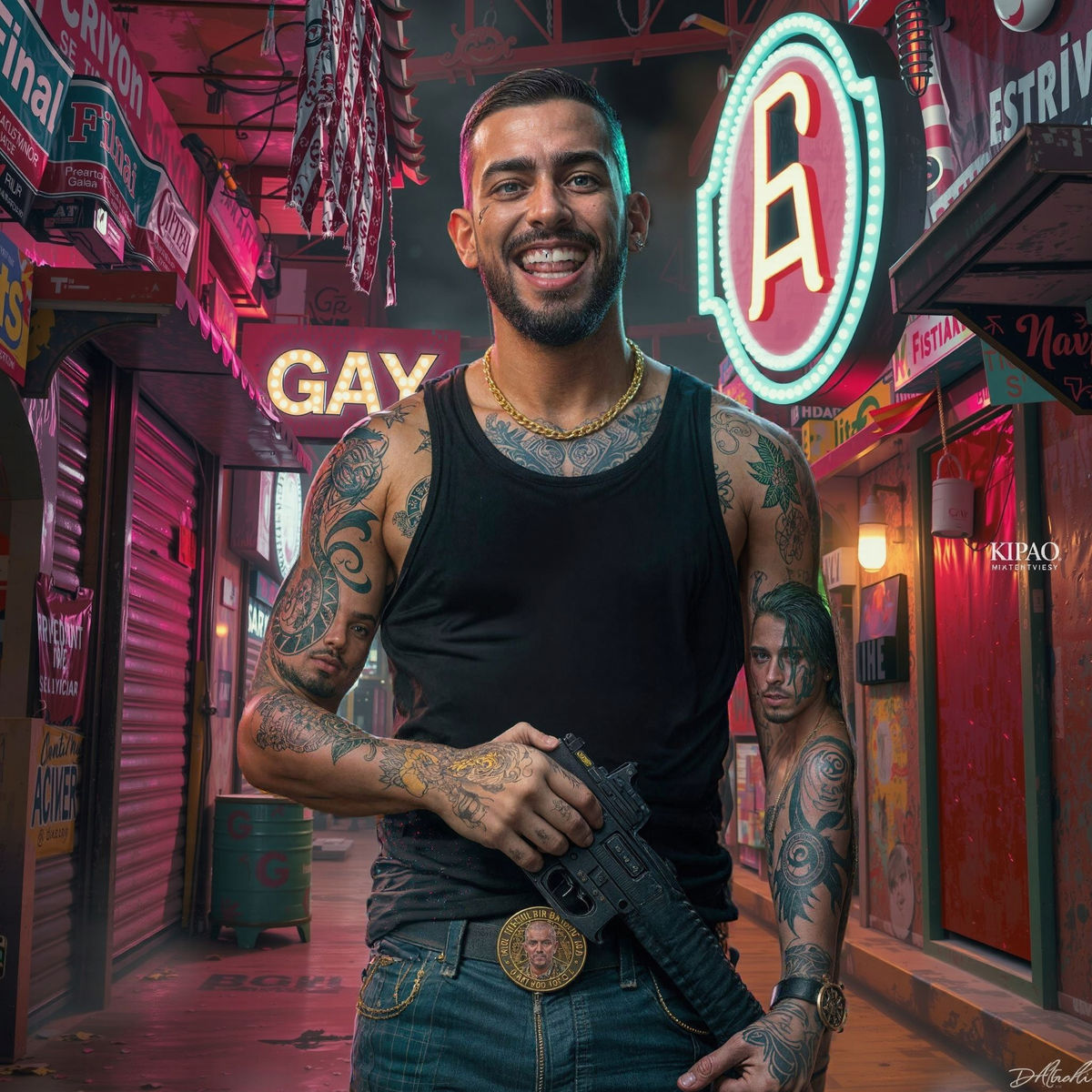 "A man in the favelas of Rio de Janeiro. He is by himself. There are no extra people in the image. He has gang tattoos on his face and a gold grill on his teeth. He is holding a gun. He is standing in a gay bar illuminated by the glow is a neon sign. Hdr. green and magenta hyperrealism photorealism photoillustration ominous detailed 8k resolution hyperrealism. The word "gay" is not in the image"