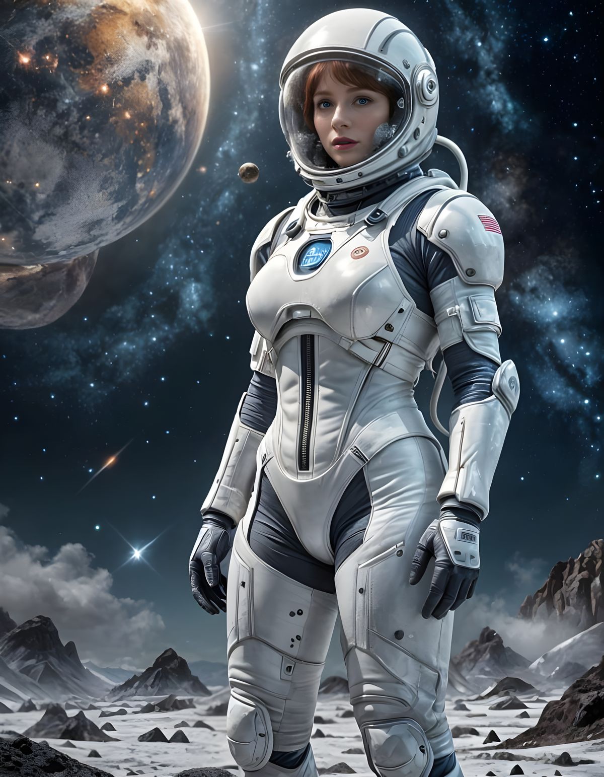 This image shows Bryce Dallas Howard as a space explorer on an alien planet. She is wearing a white spacesuit with helmet and oxygen pack, rendered in photorealistic cinematic style.