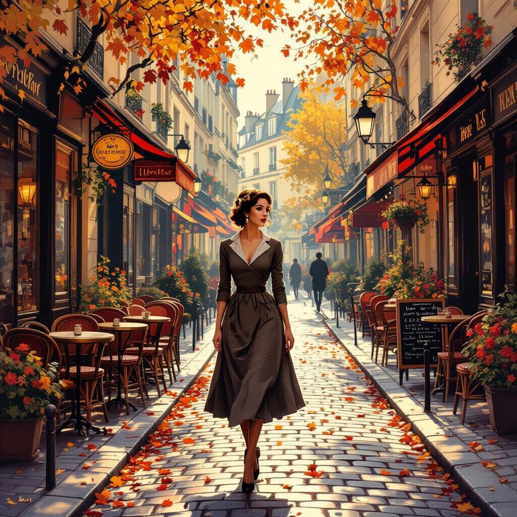 This image shows a woman in vintage dress walking on a cobblestone street with cafes and autumn leaves. The scene is bathed in warm, soft light, rendered with rich colors reminiscent of vintage travel posters.