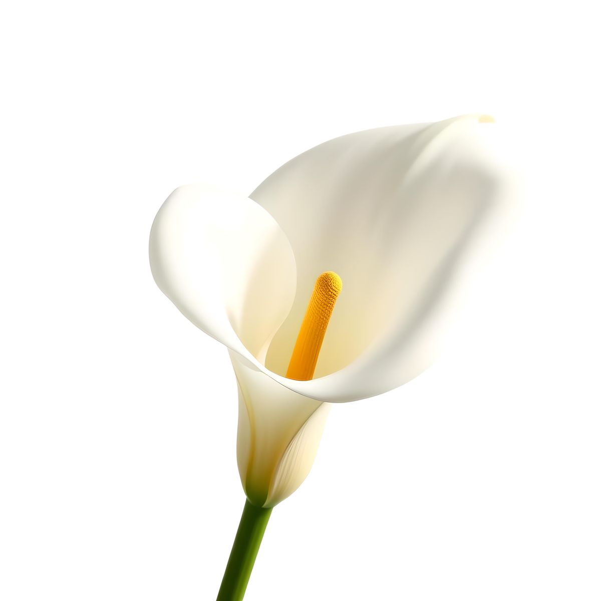 This image shows a hyperrealistic close-up of two white calla lilies. The flowers are presented as a small bunch against a stark white backdrop, emphasizing their form and purity.