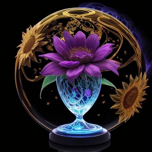 This image shows an abstract 3D mandala with metallic and neon elements. The design features an hourglass filled with glowing starlings that form a sunflower, all rendered in a cracked black and gold style.