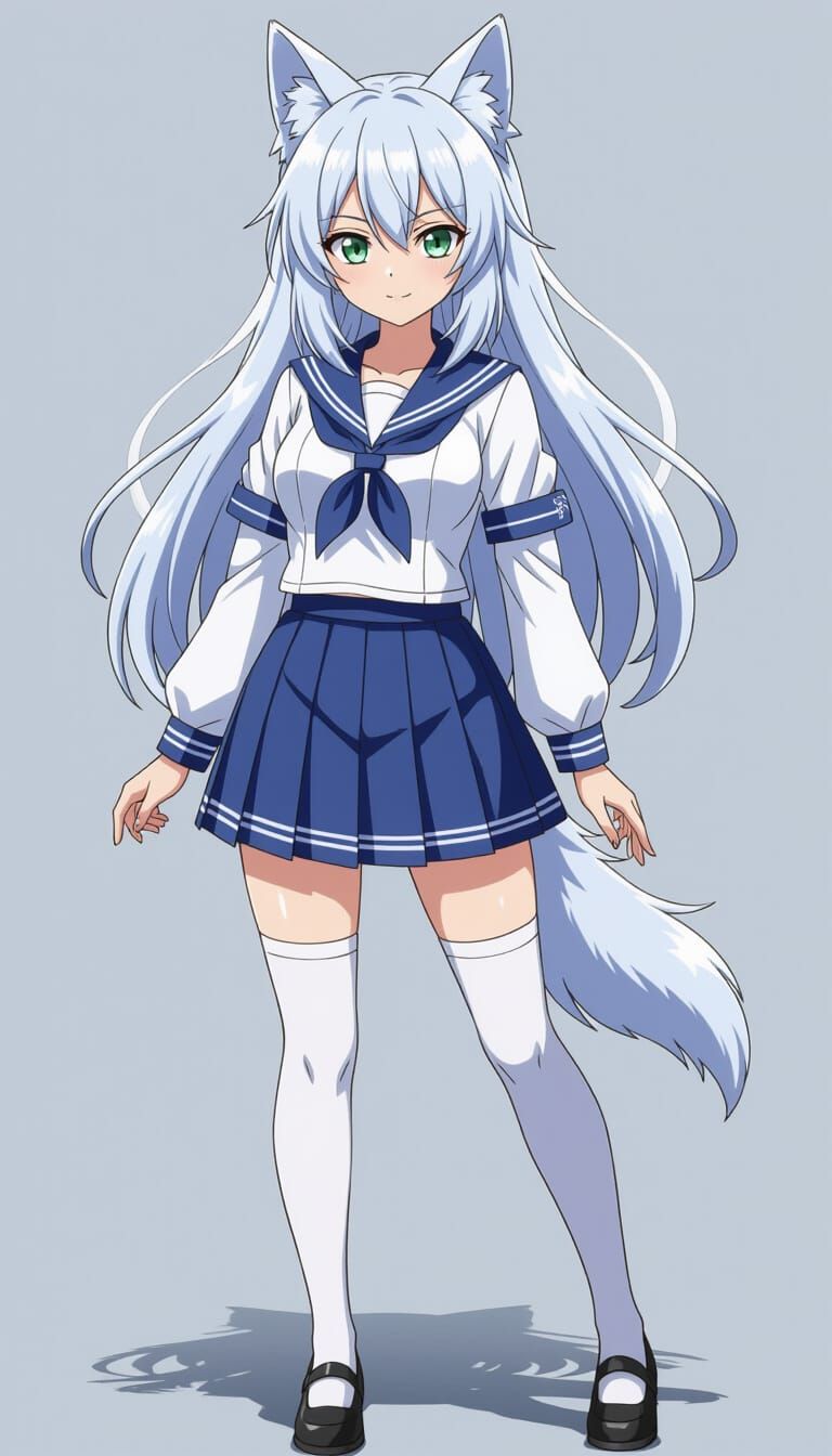 This image shows a petite wolf-eared woman with white hair and green eyes, wearing a white Seifuku uniform with a blue skirt. Rendered in a vibrant, hyper-realistic anime style, cel-shaded and deeply colored.