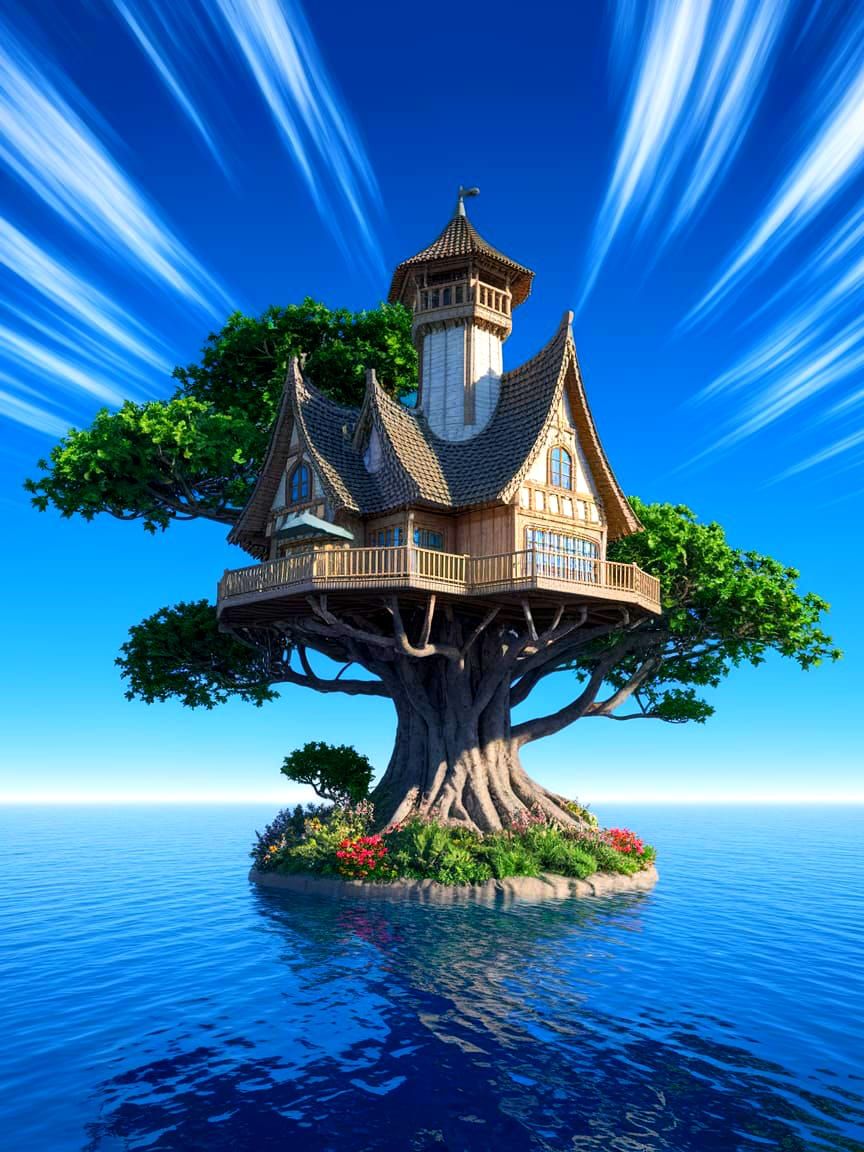 This enchanting image depicts a fantastical treehouse nestled in a lush island paradise, surrounded by a serene ocean and vibrant greenery, evoking a sense of wonder and magic.