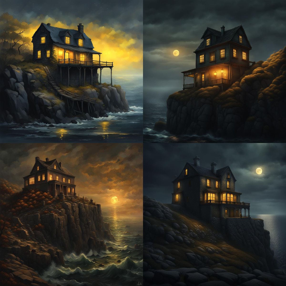 This image shows a solitary, slightly dilapidated house perched on a cliff overlooking a calm, dark sea. Warm yellow light emanates from the windows in this detailed matte painting.