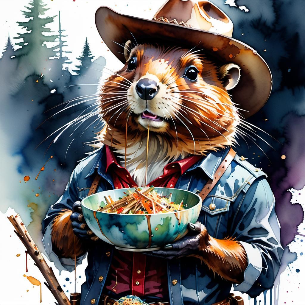 A vibrant watercolour painting of a cartoon beaver cowboy enjoying a bowl of wood. The image is highly detailed with dynamic lighting and a graffiti art aesthetic.