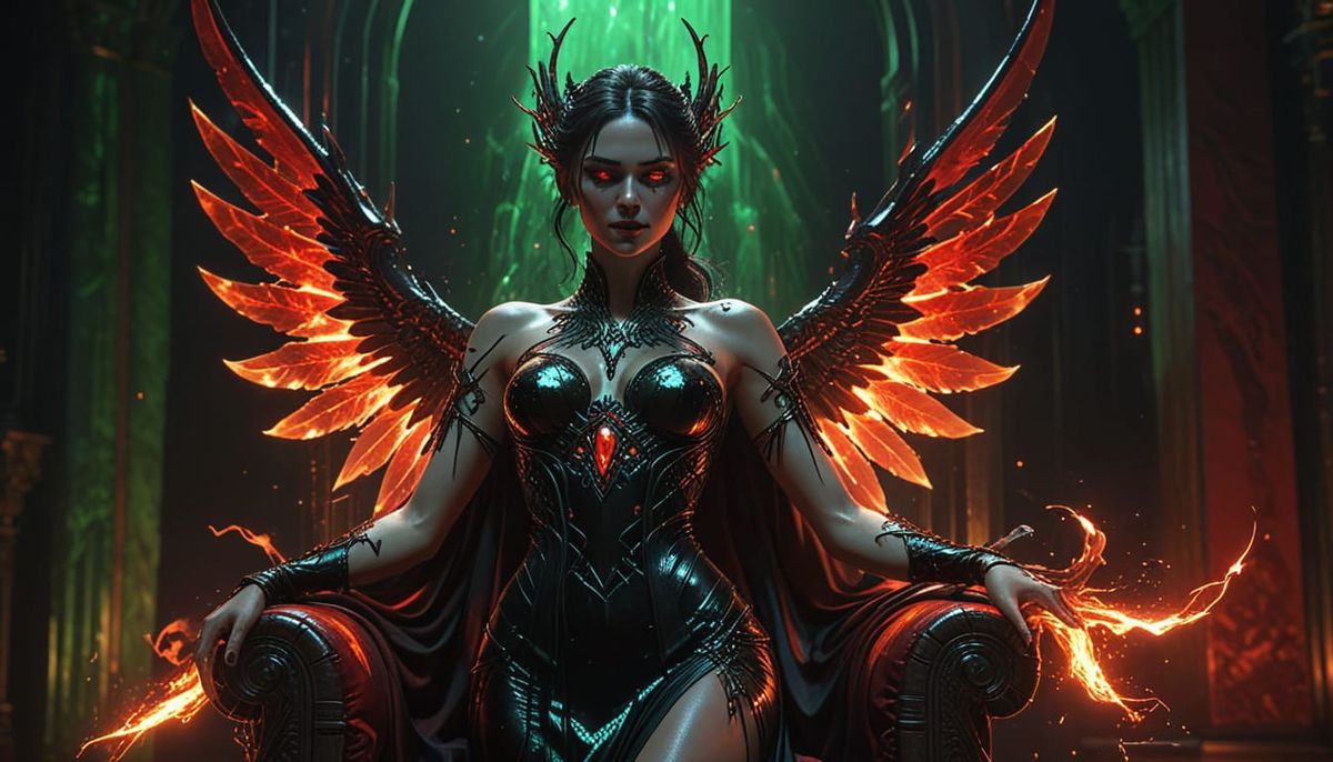 This image shows an evil Erinyes before a blood-red throne. The close-up shot features glowing green eyes and a seductive black dress. The artwork employs dynamic and volumetric lighting with deep colors, reminiscent of alcohol ink art.