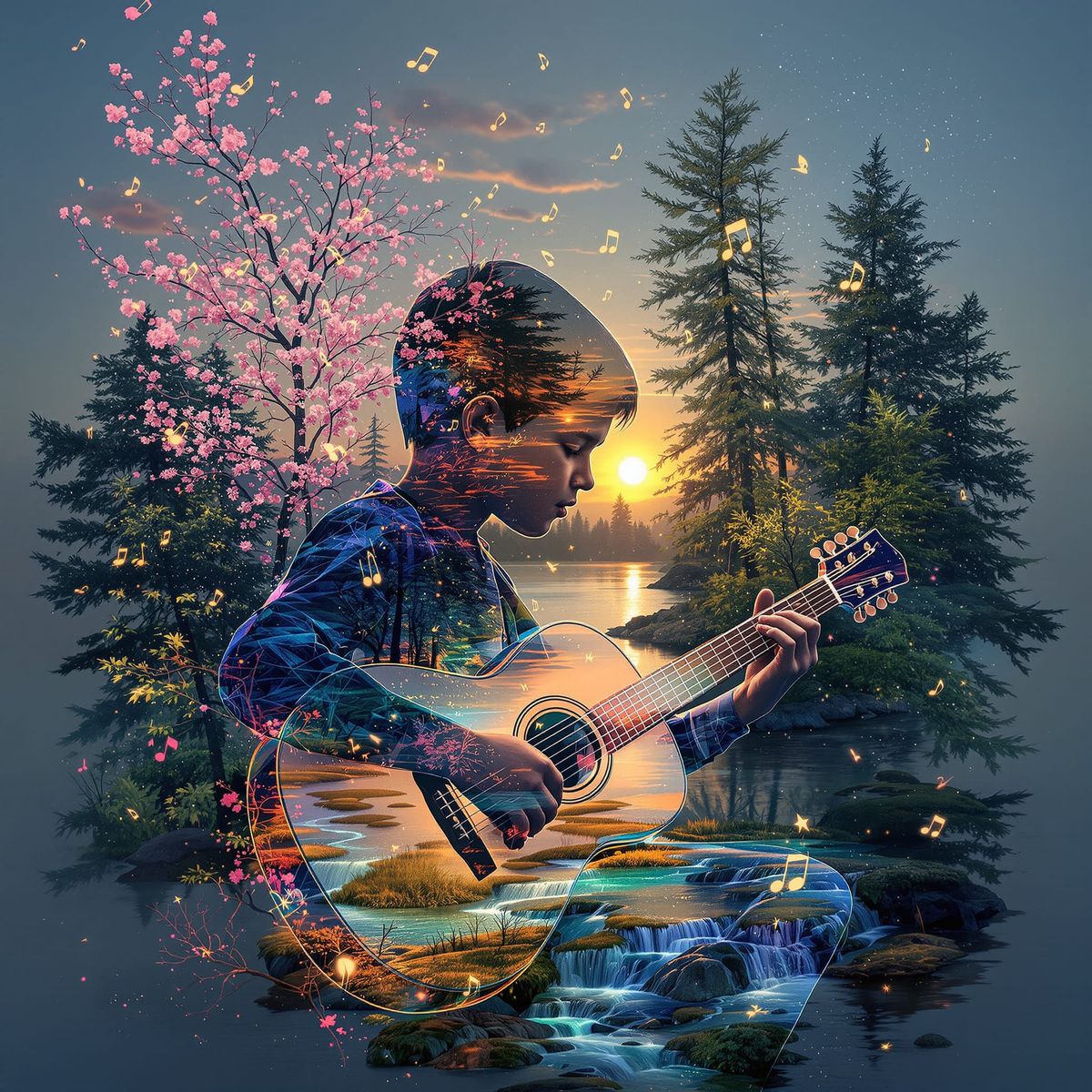 This hyper-realistic artwork features a transparent boy playing guitar amidst rivers, forests, sunsets, and blossoms. Ethereal bioluminescent elements and floating music notes create a dreamlike, layered composition.