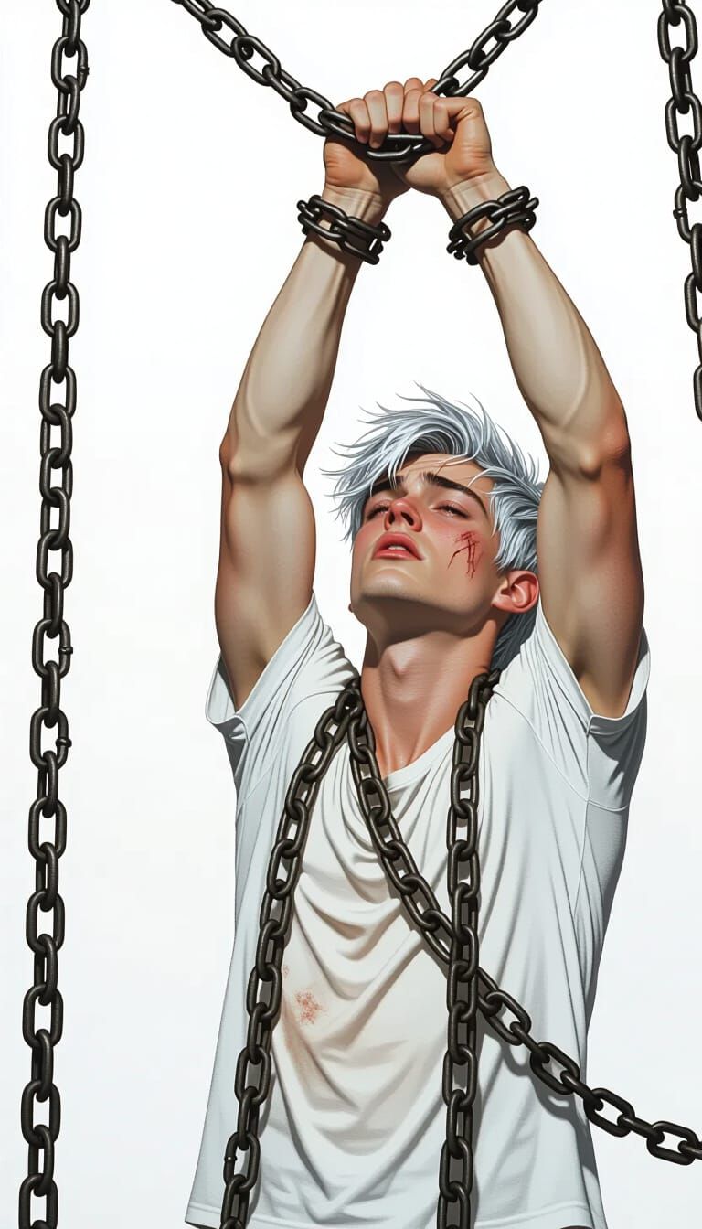 This image shows a silver-haired man, upper body in view, raising chained hands above his head. His face, strained with exhaustion, is lit dramatically in a dark, cinematic style.