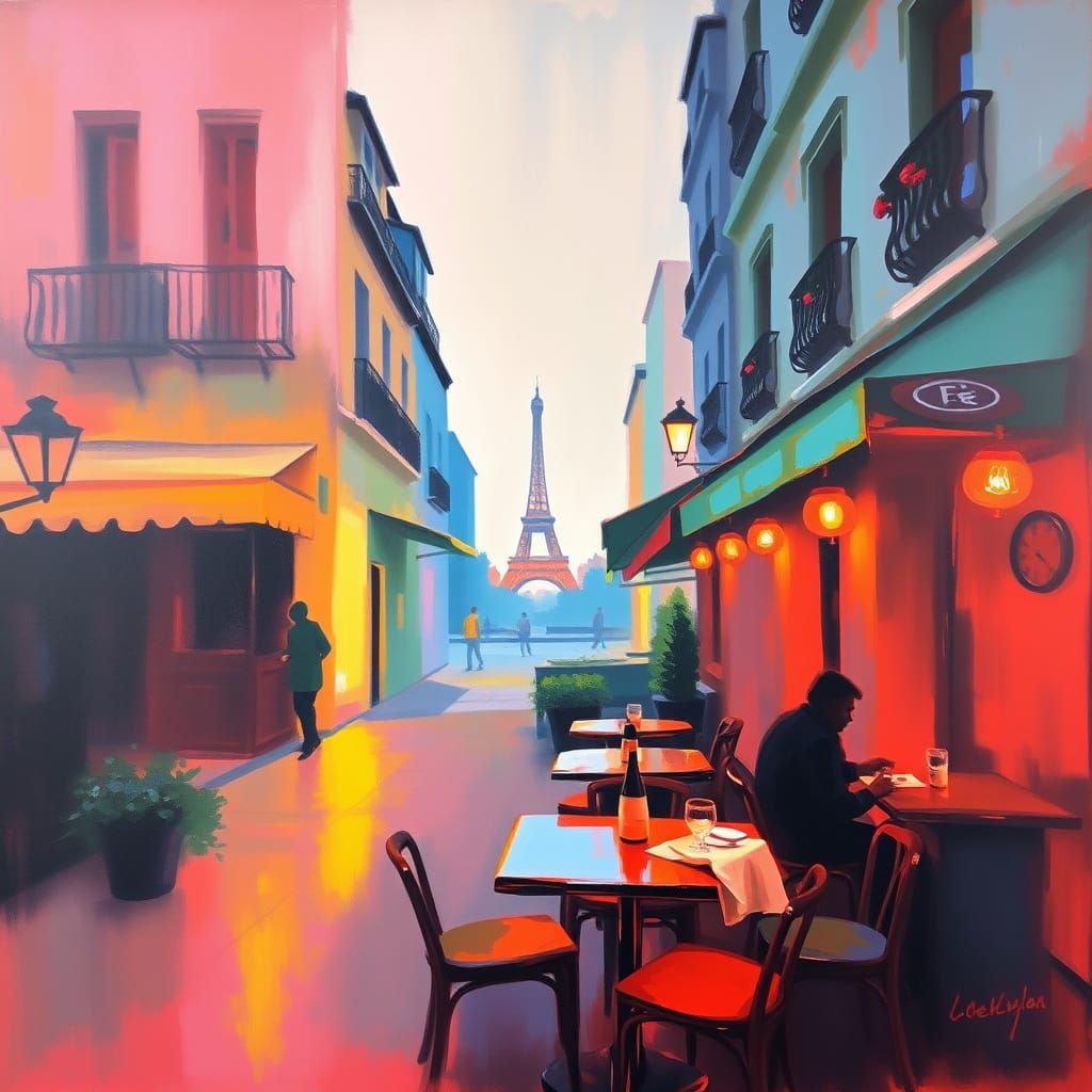 A modern abstract painting of a Paris cafe in soft colors with a neon accent. The work evokes Expressionism in an abstract style.