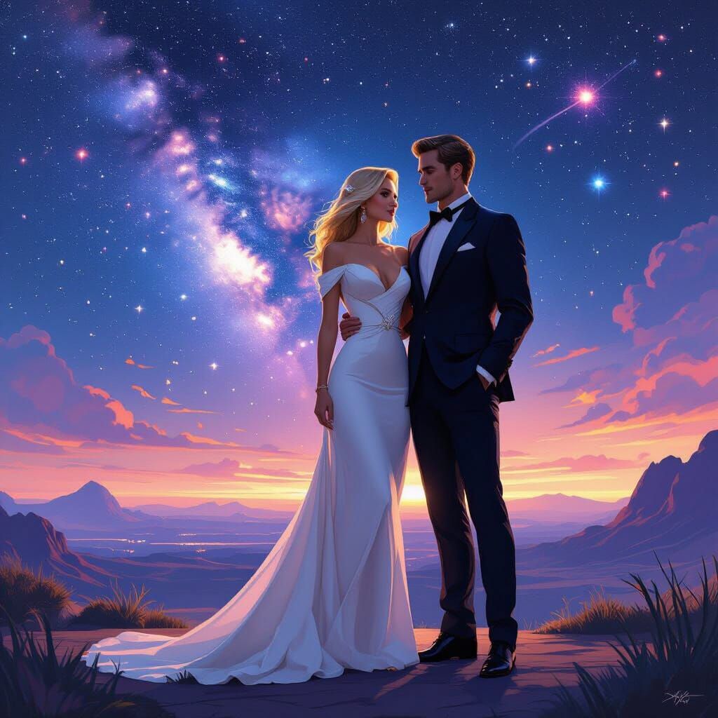 A blonde woman and her husband stand in a vast, starry universe. The scene features futuristic landscapes, neon details, and vibrant colors, evoking a dreamy aesthetic.