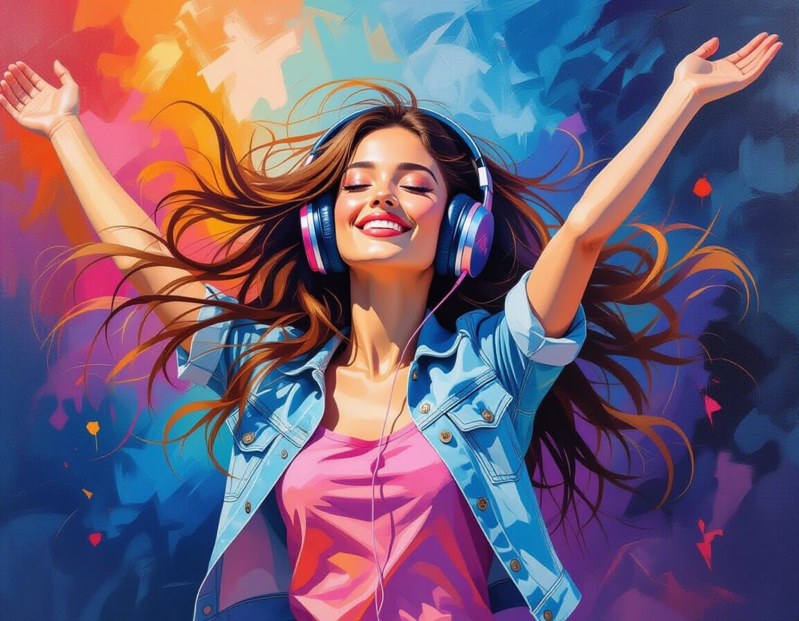 This image shows a girl with long hair dancing with headphones on. The artwork conveys a sense of joyful energy with vibrant hues and dynamic lighting, in an airbrush art style.