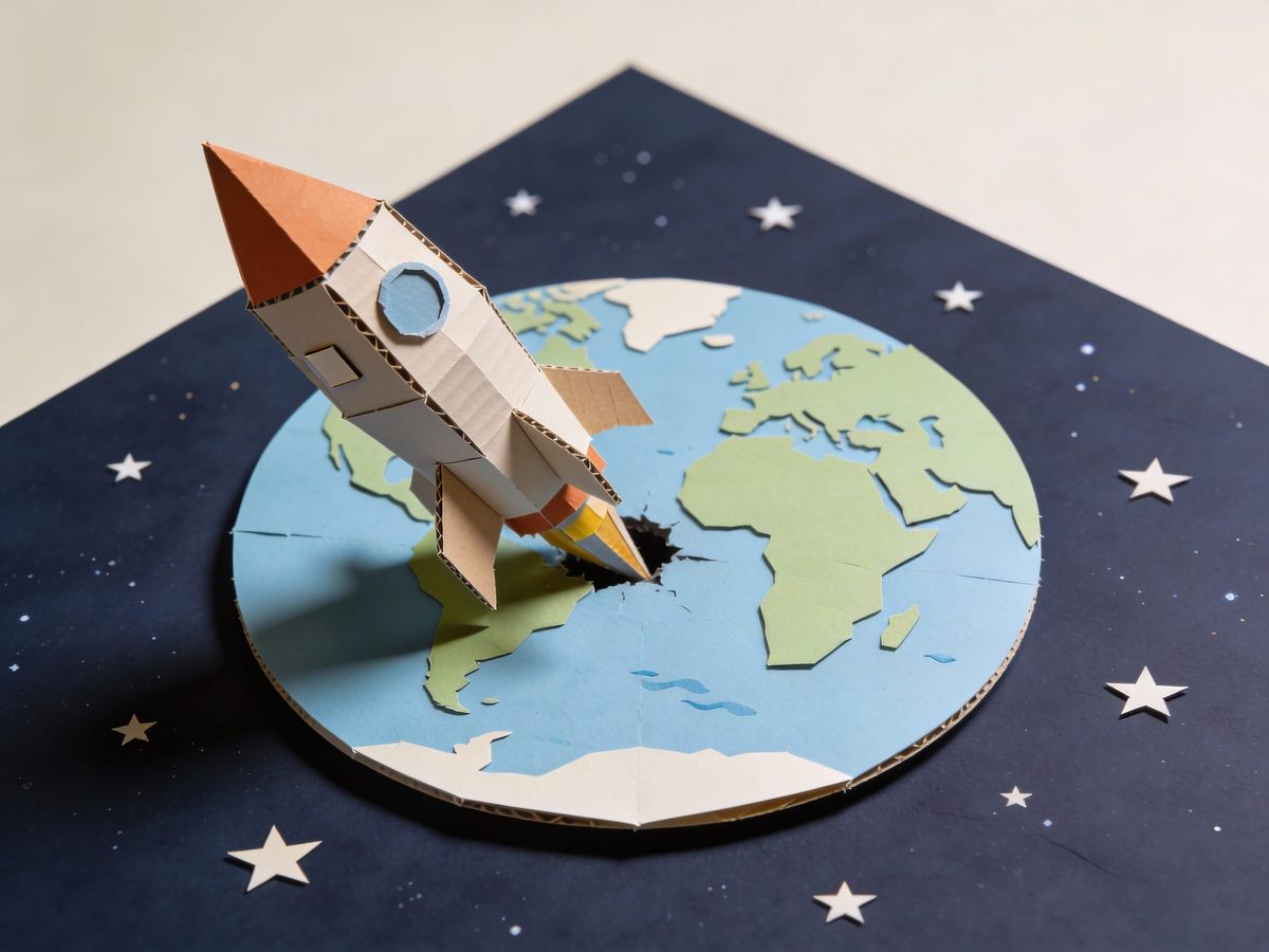 This image features a whimsical papercraft diorama where a 3D rocket ship dramatically crashes into a flat, 2D paper Earth. It's a clever mixed-media illustration emphasizing the contrast between dimensional and flat forms in deep space.