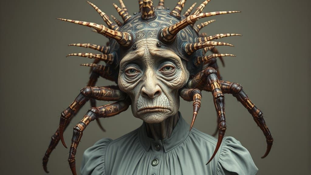 This image depicts a humanoid creature with the head of a lionfish, resembling an elderly woman in a beige and blue dress. The artwork is inspired by the detailed, fantastical style of Jean-Baptiste Monge.