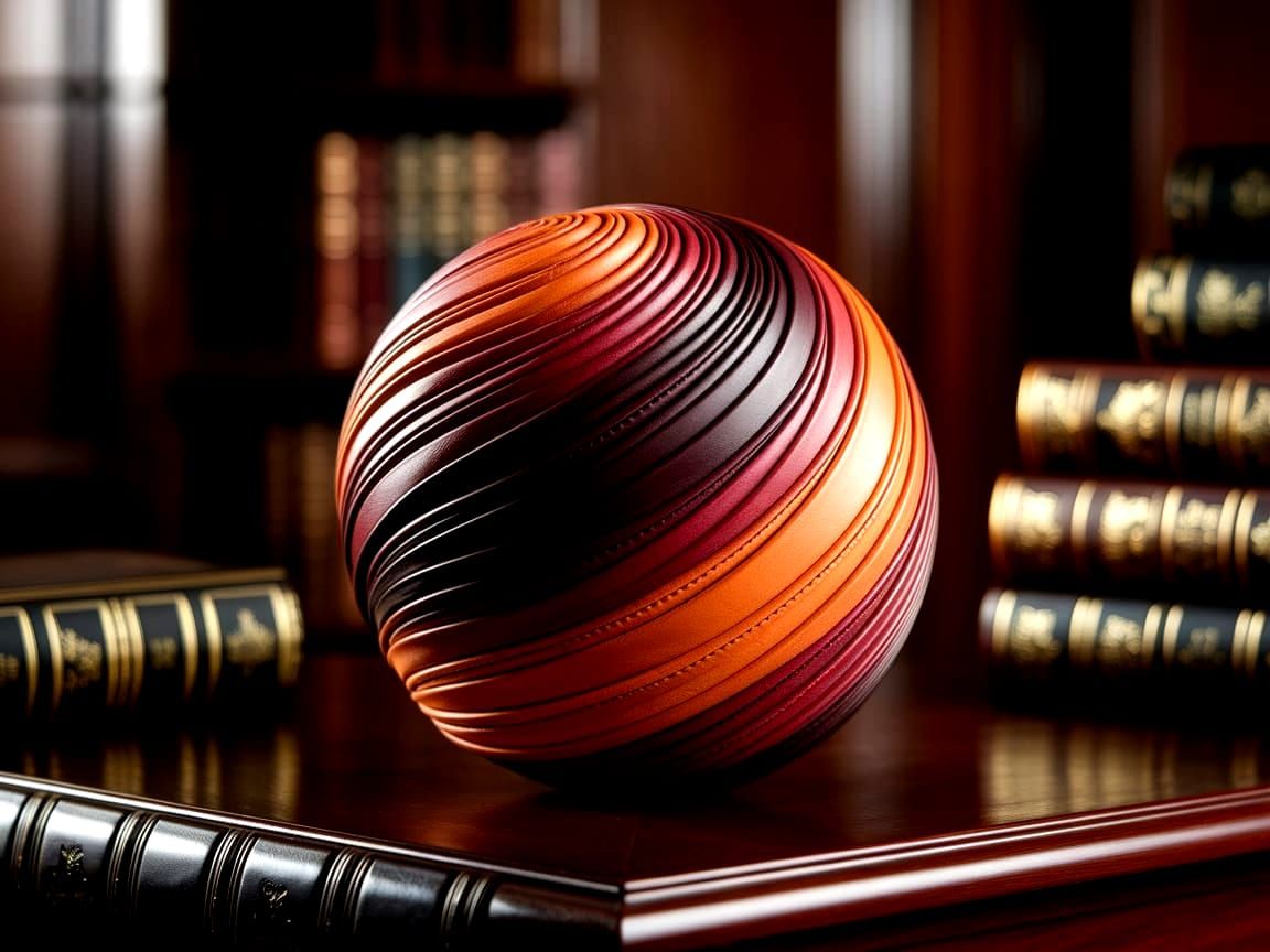 This image shows a sphere made of swirling, multicolored leather textures in warm hues, resting on a polished mahogany surface. Soft ambient light highlights the intricate details of the artisanal sphere, set against a blurred background of a luxurious study.