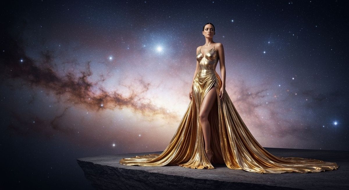 This image features a regal woman in a shimmering, abstract gown of liquid gold, posing serenely on a precipice overlooking a vast, star-filled cosmos. The style is haute couture fashion photography with surreal and ethereal elements.