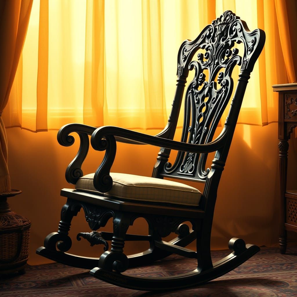 A stunning image of an ornate Queen Anne rocking chair. The chair features intricate carvings and a plush cushion, all illuminated by warm, golden light. The image has illustrative qualities.