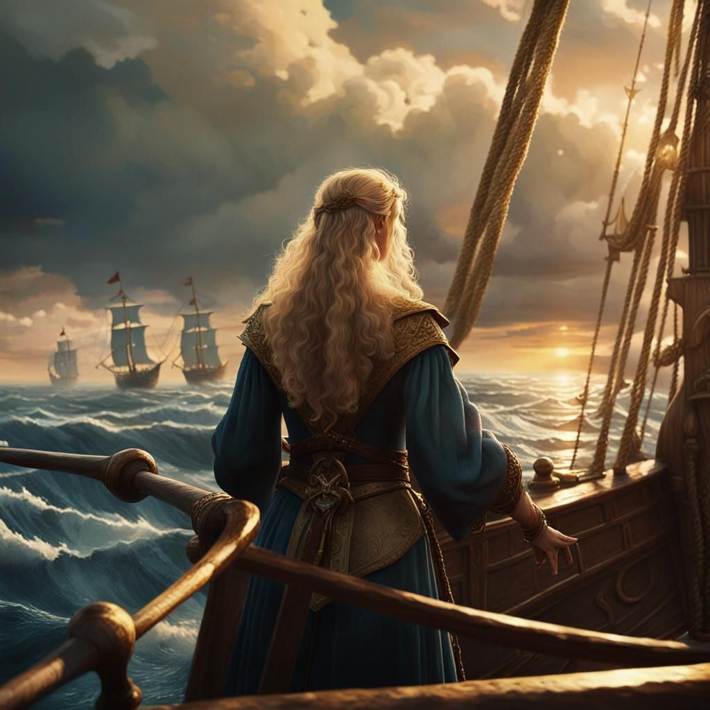 A cinematic image of a woman on a ship sailing the open sea. Evokes an epic fantasy art style with warm colors and dramatic lighting, reminiscent of classic heroic adventure illustrations.
