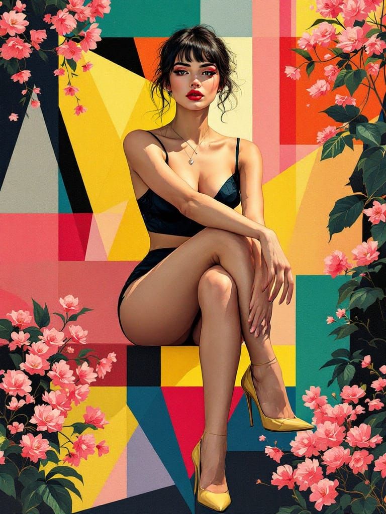 This image showcases a striking blend of digital cubism and editorial modernism, featuring a vibrant, Mondrian-inspired abstract figure study with geometric patterns, set against an abstract background merging with a soft, retro-inspired garden scene featuring cherry blossoms and bold lighting.