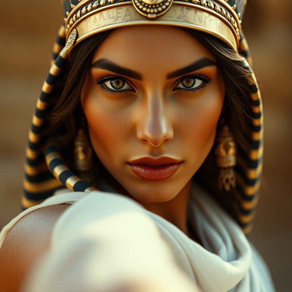 This stunning portrait captures the essence of ancient Egyptian beauty, with a woman's direct gaze and subtle, enigmatic smile. Shot in a cinematic style reminiscent of 35mm film, with warm tones and a golden film grain, this breathtaking image exudes an epic, timeless quality.