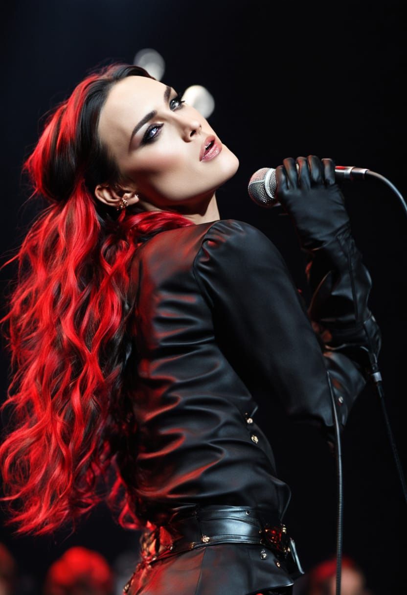 This image is a highly detailed depiction of a pop-rock singer, showcasing a stunning baroque hairstyle and striking features, set against a dynamic stage presence.