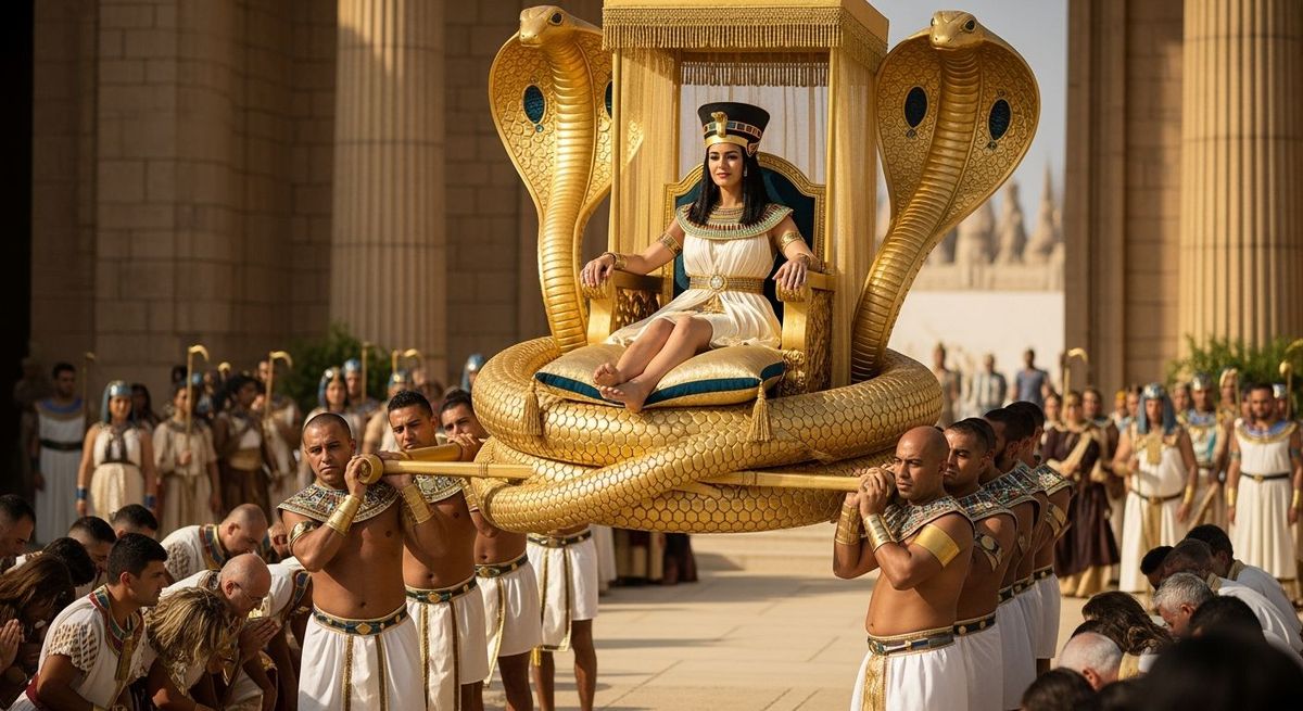 This image shows an Egyptian queen on a golden throne carried by servants as a crowd bows. The photograph captures the scene with sharp focus, natural light and a shallow depth of field.