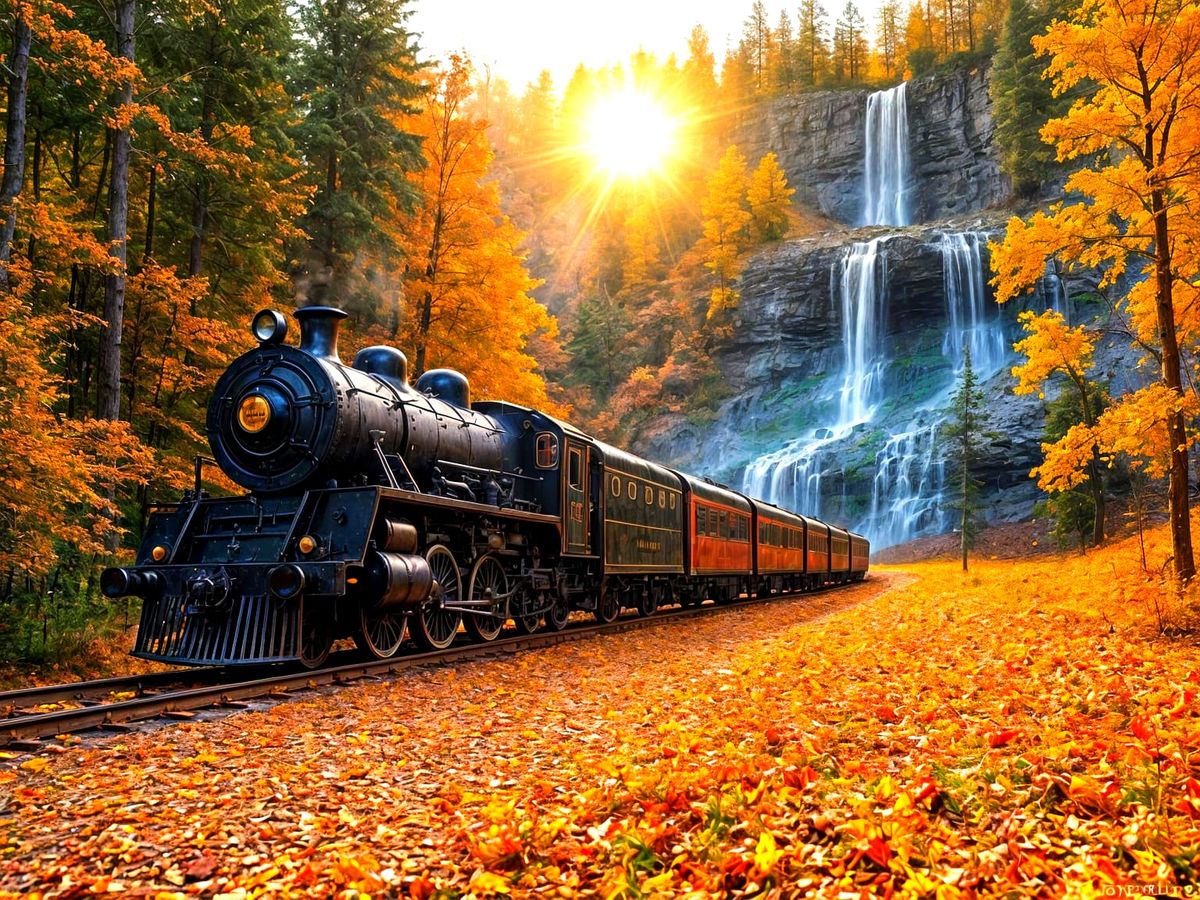 This image showcases a breathtaking, cinematic landscape with a vintage steam train chugging through a majestic valley surrounded by vibrant autumnal trees and a majestic waterfall, creating a moody and atmospheric scene with deep colors and intricate details.