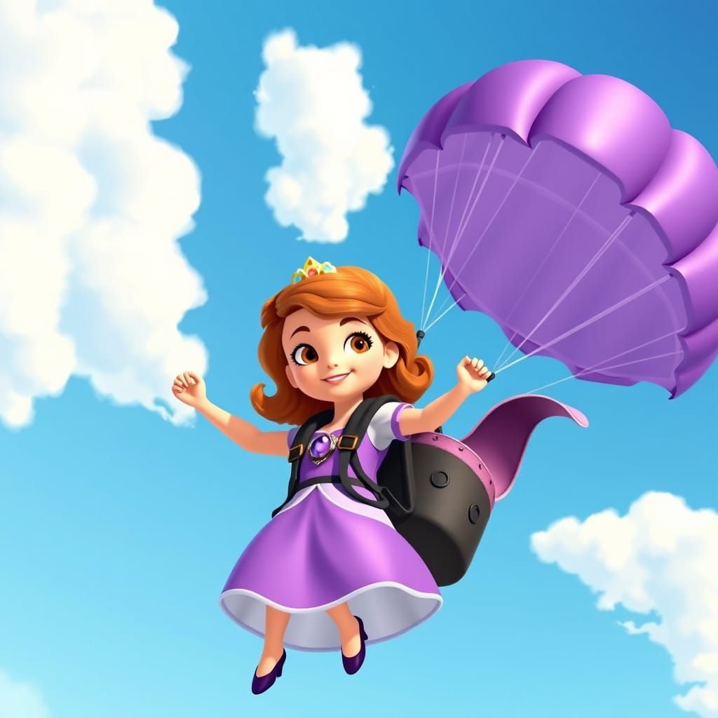 This image shows Princess Sofia soaring through the sky with a parachute. The artwork evokes a whimsical Disney style, using vibrant colors and playful textures to capture the princess's adventurous spirit.