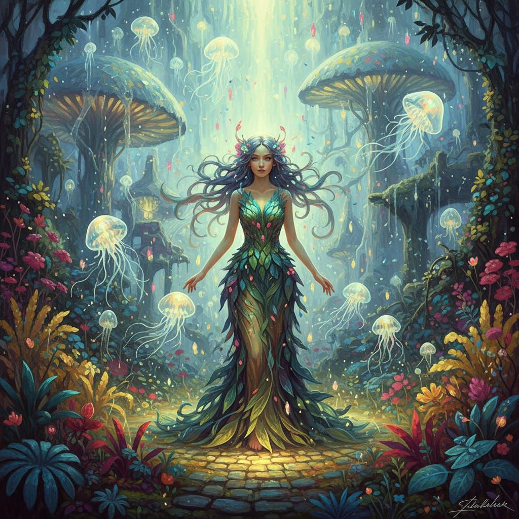 A mystical woman stands in a vibrant, secret flower garden. Hyperdetailed mist and luminous lighting create an ethereal fantasy atmosphere with intricate textures.