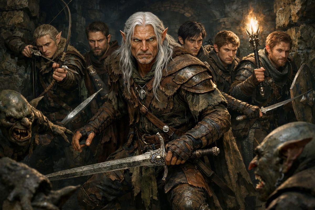 This hyperdetailed image shows an ancient elf ranger in leather armor, sword at his hip, ready to fight goblins with his mixed elven and human party.