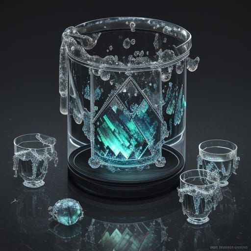 A striking picture of surreal jewelry boxes featuring glass cylinders and beakers with smokey multicolored liquid. The glass art style features luminescent details, icy bubbles, and zirconia accents in dark, cinematic lighting.