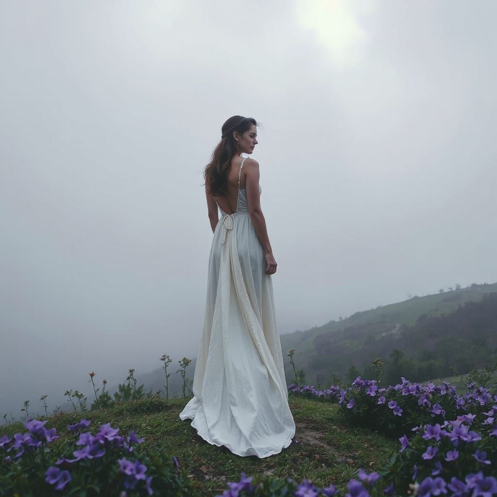 This image shows a solitary woman in a white dress amidst a misty landscape filled with purple flowers. The artwork evokes a melancholic mood in an art nouveau style.
