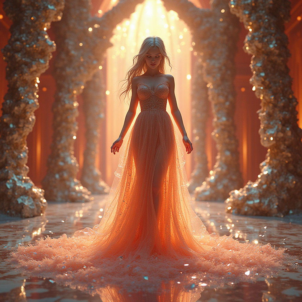 A shimmering palace of mirrors reflects light through countless crystals. The image focuses on a detailed amber sculpture of a woman, rendered in 8k resolution with a fairycore aesthetic.