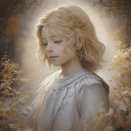 A watercolor painting of a blond European boy in a dreamy, ethereal style. The artwork features soft lighting and a warm color palette, evoking a sense of innocence.