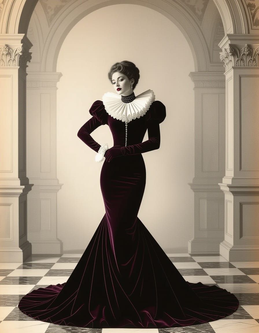 This image showcases a striking woman in an elaborate dark velvet gown, rendered with dramatic chiaroscuro lighting and exaggerated contorted poses characteristic of Mannerism.