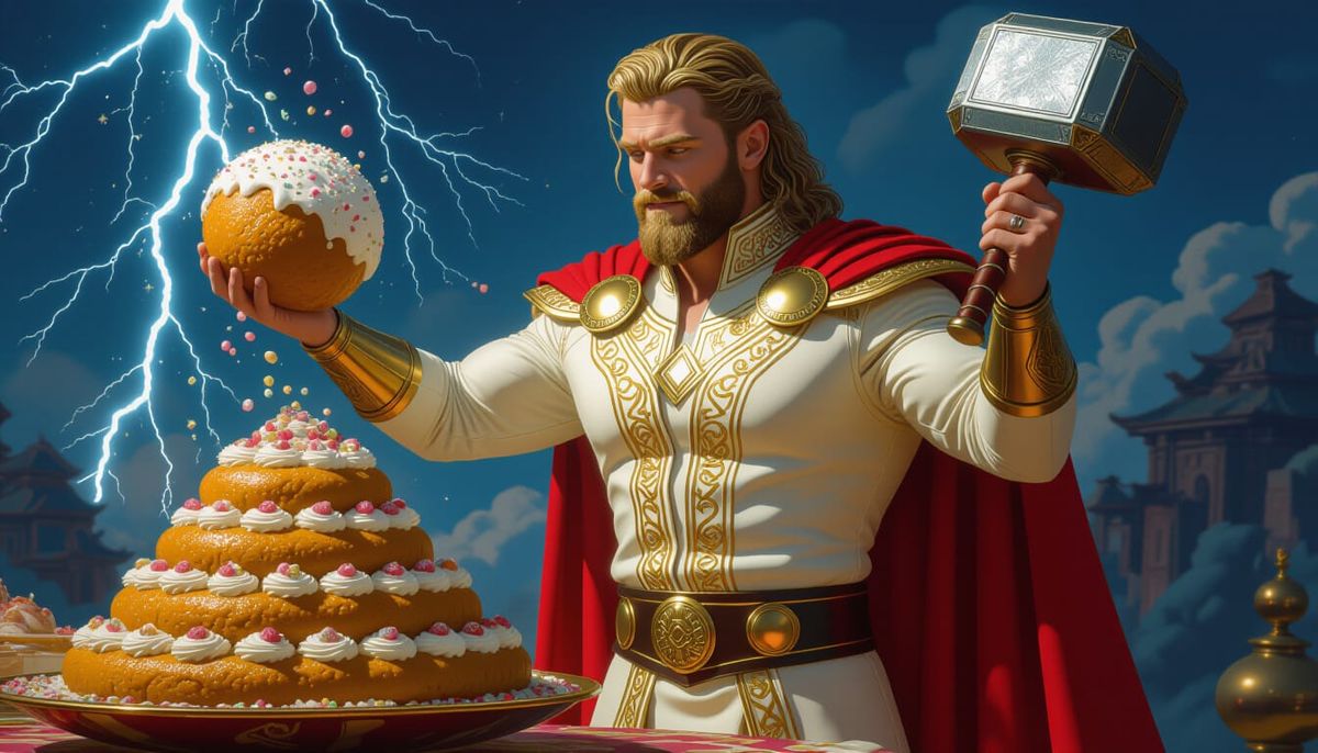A digital artwork of Thor in traditional Indian attire, humorously using Mjolnir to lift a giant sweet. Soft lightning illuminates the scene, styled as futuristic digital art.
