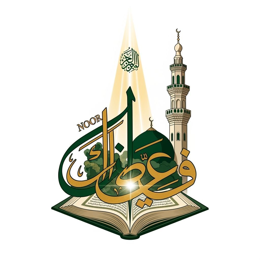 This image shows Arabic calligraphy of 'Noor', 'Ilm', and 'Ayah' blended with Islamic symbols. The artwork features traditional Kufic and Thuluth scripts and a gold and deep green palette.