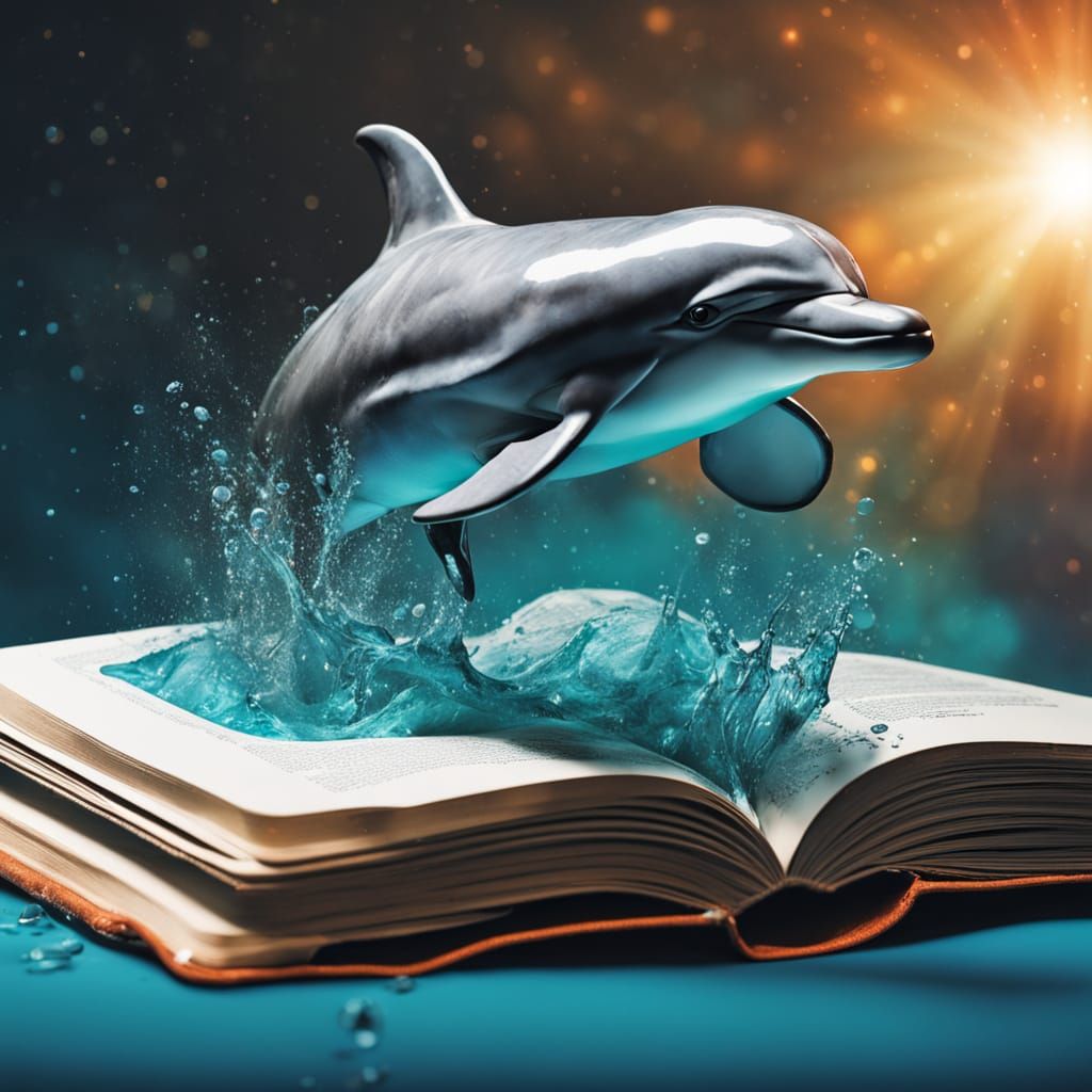 This striking image captures a dolphin bursting forth from an open book in a vibrant, detailed scene. Soft focus on the book's pages contrasts with the dolphin's sleek, side-lit body, set against a colorful background with subtle texture and glowing aqua accents on its fins.