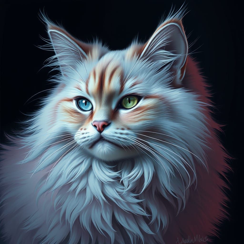 This image features a fluffy, longhaired cat with a friendly expression, depicted in soft pastel shades of pink, mint, and light blue. Rendered with dramatic, dark fantasy elements and volumetric lighting.